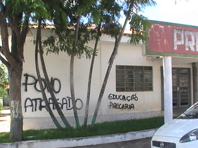Frases como "Desvio de verbas", "Falta de água", "Vocês não fazem nada", "Educação Precária", "Povo Atrasado" e "Idiotas", foram escritas em tinta spray preta nas paredes da frente e na lateral esquerda da prefeitura muniipal. O crime contra o patrimônio público pode ter características de protesto ou de ação política. A redação do JRdiario, tentou ligar para o secretário de administração, mas as mesmas não conseguiram ser completadas. Por volta do meio-dia, a reportagem flagrou um funcionário apagando as frases, cobrindo-as com tinta branca.