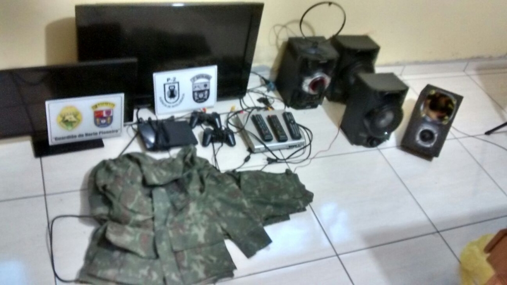 Foi autorizada a busca domiciliar pela esposa do suspeito, sendo localizado um revólver calibre .32 com seis munições intactas, 101 gramas de crack, uma balança digital, vários aparelhos eletroeletrônicos de procedência duvidosa e uma farda do Exército Brasileiro.