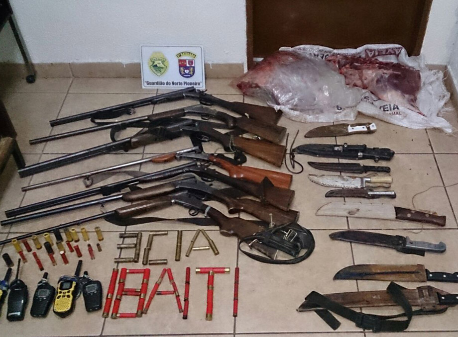 Foram localizadas no interior dos automóveis sete espingardas de diversos calibres, 74 munições, além de rádio comunicadores, cães de caça, facas e aproximadamente 35 kg de carne de javali.