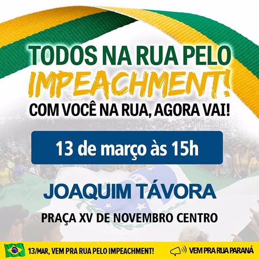 Manifestações a favor do impeachment da presidente da República, Dilma Rousseff (PT), aconteceram neste domingo (13) em ao menos 87 cidades de todos os estados do país e do Distrito Federal. A estimativa do total de manifestantes no Brasil foi de 83 mil pela Polícia Militar e 407 mil pelos organizadores.