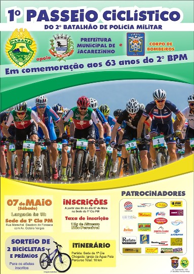Convido a todos os amigos da imprensa, bem como solicito que realizem a ampla divulgação dos cartazes em anexo, referentes aos enventos "1º Passeio Ciclístico do 2º Batalhão" e "1º Passeio Ecológico Motociclístico Solidário do 2ºBatalhão", ambos os eventos em comemoração ao 63 º Aniversário do 2º Batalhão de Polícia Militar.