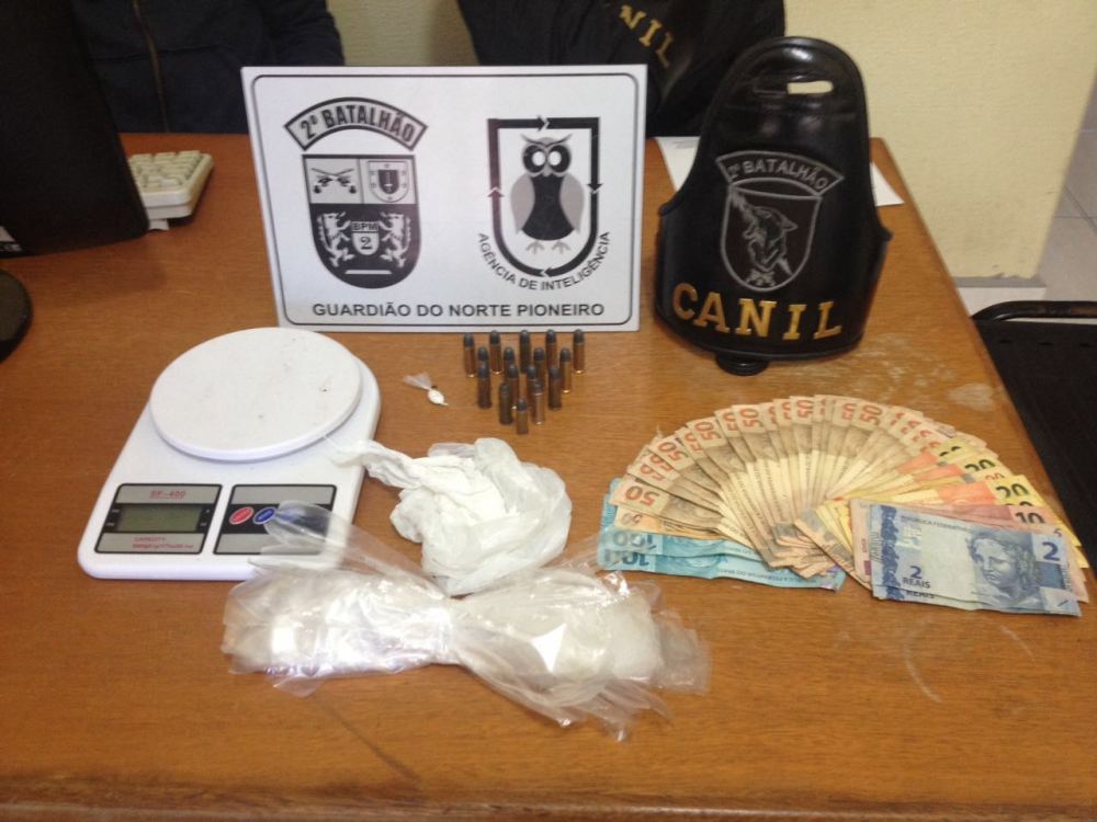 Na seqüência, os PMs também abordaram a residência do citado narcotraficante, onde foram apreendidas cocaína, 01 munição calibre .32 e 15 munições no calibre .38, uma balança de precisão, embalagens para drogas e R$1.459,00.