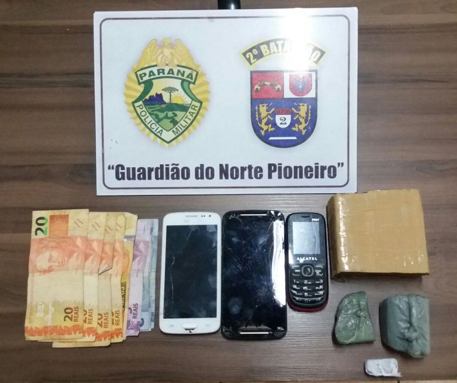 > Policiais Militares do Serviço Reservado de Ibaiti apreenderam dois adolescentes pelas proximidades da estrada rural do Bairro Água da Limeira com 4 invólucros plásticos contento um total de 300 gramas de substância análoga à maconha, além de aparelhos celulares. Ainda durante as diligências, foi apreendido o suposto fornecedor da droga, e com ele foi localizado depósitos bancários, folhas contendo a possível contabilidade das drogas, além de celulares contendo fotos da droga apreendida com os adolescentes e fotos de armas de fogo.