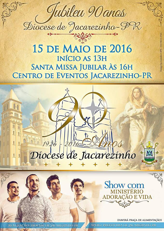Uma festa reunirá centenas de fiéis, neste domingo, dia 15, para a celebração dos 90 anos de fundação da Diocese de Jacarezinho. As festividades do jubileu acontecerão no Centro de Eventos de Jacarezinho, a partir das 13 horas. A grande atração do evento será o show do Ministério de Adoração e Vida, às 19 horas.