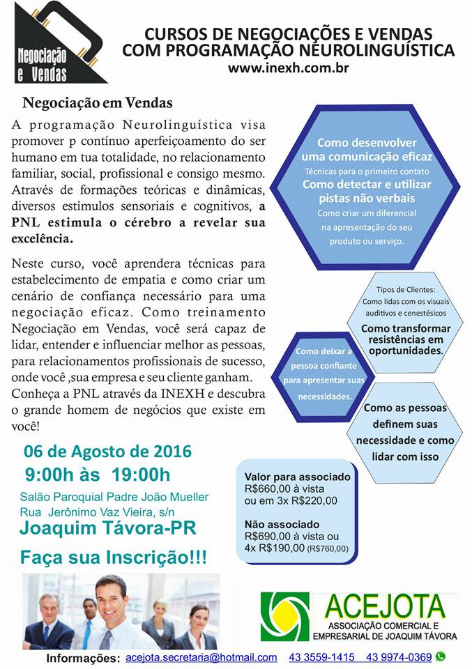 A ACEJOTA (Associação Comercial e Empresarial de Joaquim Távora), realiza no dia 06 agosto (sábado),em Joaquim Távora, curso em negociação e vendas com programação em Neurolinguística.