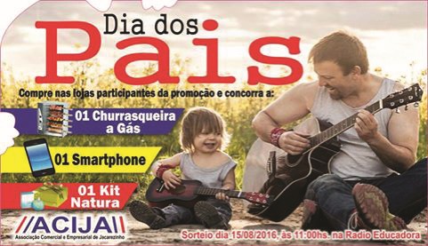 A Associação Comercial e Empresarial de Jacarezinho (ACIJA) está realizando a campanha do “Dia dos Pais”. Os compradores no comércio de Jacarezinho concorrerão a uma “Churrasqueira a Gás”, “Smartphone” e “Kit Natura”. O sorteio acontecerá no dia 11 de agosto às 11 horas na Rádio Educadora.