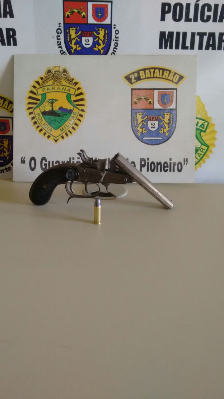 Os PMs localizaram a arma de fogo, uma garrucha calibre 32, e efetuaram a prisão do autor, que confessou ser o responsável pela arma.