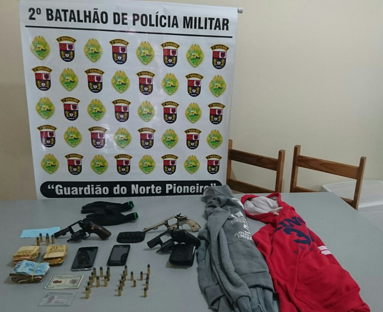 Durante a abordagem, havia dois indivíduos no interior do veículo – 42 e 35 anos, ambos da cidade de Abatiá-PR. No interior do automóvel os PMs encontraram as vestes utilizadas no crime e 1 revolver calibre .38 com 5 munições intactas, além de R$ 7.512,00 em notas diversas, sendo dois maços com cinta timbrada do Banco do Brasil, localizadas dentro do para-choque traseiro do automóvel.