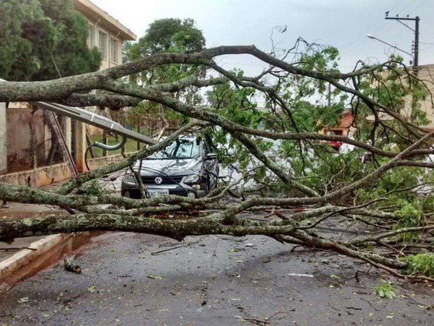 Por causa do vento, caíram árvores e um poste de energia em Maracaí (SP). Ninguém ficou ferido. Segundo a Polícia Militar, uma das árvores caiu em cima de um carro na Rua Amália Marta de Souza. Já outra árvore caiu do lado da base da PM na Rua Pedro Gonçalves da Mota.