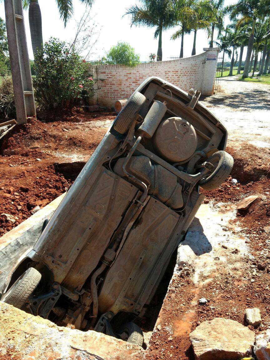 Ele conduzia sua Parati(placas AJB 9884) quando caiu num buraco onde estão sendo construídas galerias(fotos).