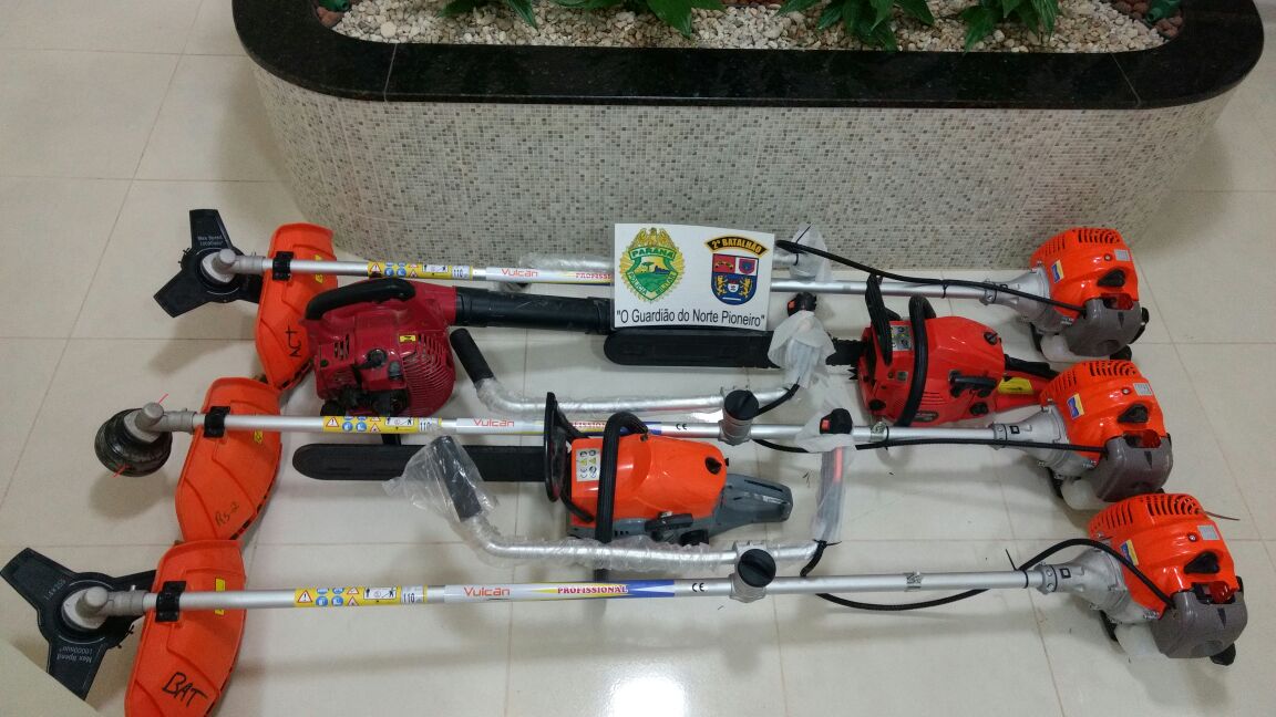 Os maquinários estavam em um terreno baldio às margens da Rua Jacob Neunam, no Bairro São Cristóvão. Foram recuperadas 3 roçadeiras, 2 motosserras e 1 soprador, todos da marca Vulcan.