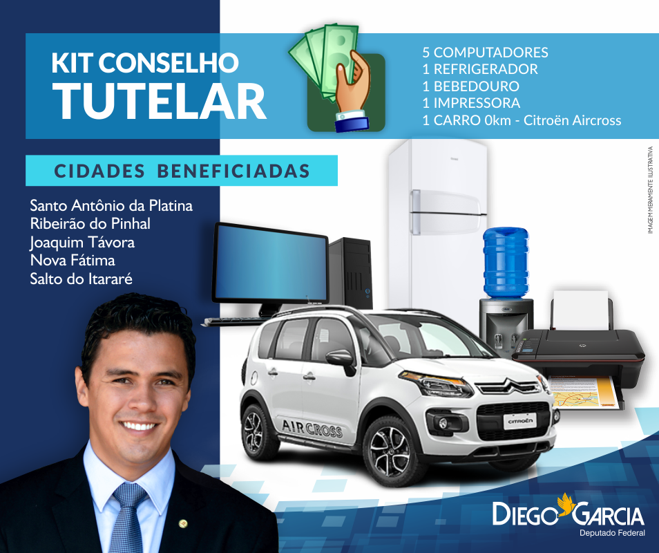 Nesta segunda-feira (20) o deputado Diego Garcia (PHS-PR) irá entregar os Kits de Conselhos Tutelares, destinados por ele através de emenda parlamentar de R$ 310 mil! Os Kits serão entregues para os municípios de Santo Antônio da Platina, Ribeirão do Pinhal, Joaquim Távora, Nova Fátima e Salto do Itararé! Muitas cidades ainda serão beneficiadas nos próximos anos! Não perca: Local da entrega: Concessionária Citröen Provence - Av Ernesto Vilela, nº 1818, bairro Nova Rússia - Cidade: Ponta Grossa PR Horário: 11h30 Data: 20/03/2017.