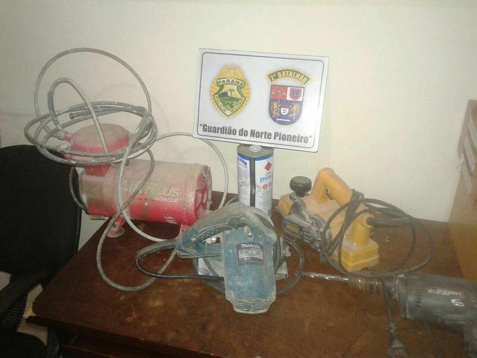 Foi então feito patrulhamento pelo bairro a fim de encontrar o suspeito, durante o patrulhamento fomos informados por populares que ele estava transitando pelo bairro com um saco nas costas, deslocamos até onde estaria o suspeito e abordado foi encontrado em poder de algumas ferramentas (uma furadeira, um compressor de ar,uma serra circular e uma plaina para madeiras), foi então encaminhado o suspeito e os objetos para que a vítima reconhecesse; ela disse não ser de sua propriedade,mas sim de seu cunhado que esta trabalhando próximo de onde o suspeito foi abordado; já em contato com o cunhado, o mesmo reconheceu sendo de sua propriedade tais objetos. Diante dos fatos foi dado voz de prisão ao indivíduo e encaminhado até a delegacia para as devidas providências.