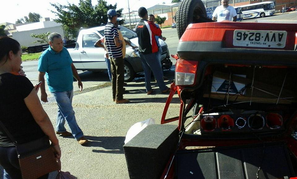 Por volta das quatorze horas e trinta minutos, de ontem, sexta-feira (28), no trevo da saída de Joaquim Távora para Quatiguá, Pr 092, um veiculo Fiat Uno placas (AVV-8246) de Tomazina- Pr conduzido por Luiz Otavio Andrade, 26 anos, da cidade de Guapirama, não viu a aproximação da caminhonete strada placas (EVH-9854) de Ourinhos-SP, conduzida por Gerson Barbosa Leal, 46 anos, que veio colidir lateralmente fazendo com que o uno viesse tombar causando prejuízo de grande monta, porém os dois condutores não se feriram.