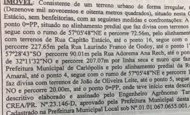 O local está com a matrícula de número 4.923 no Registro de Imóveis, cuja titular é Maria Zélia Queiroz.