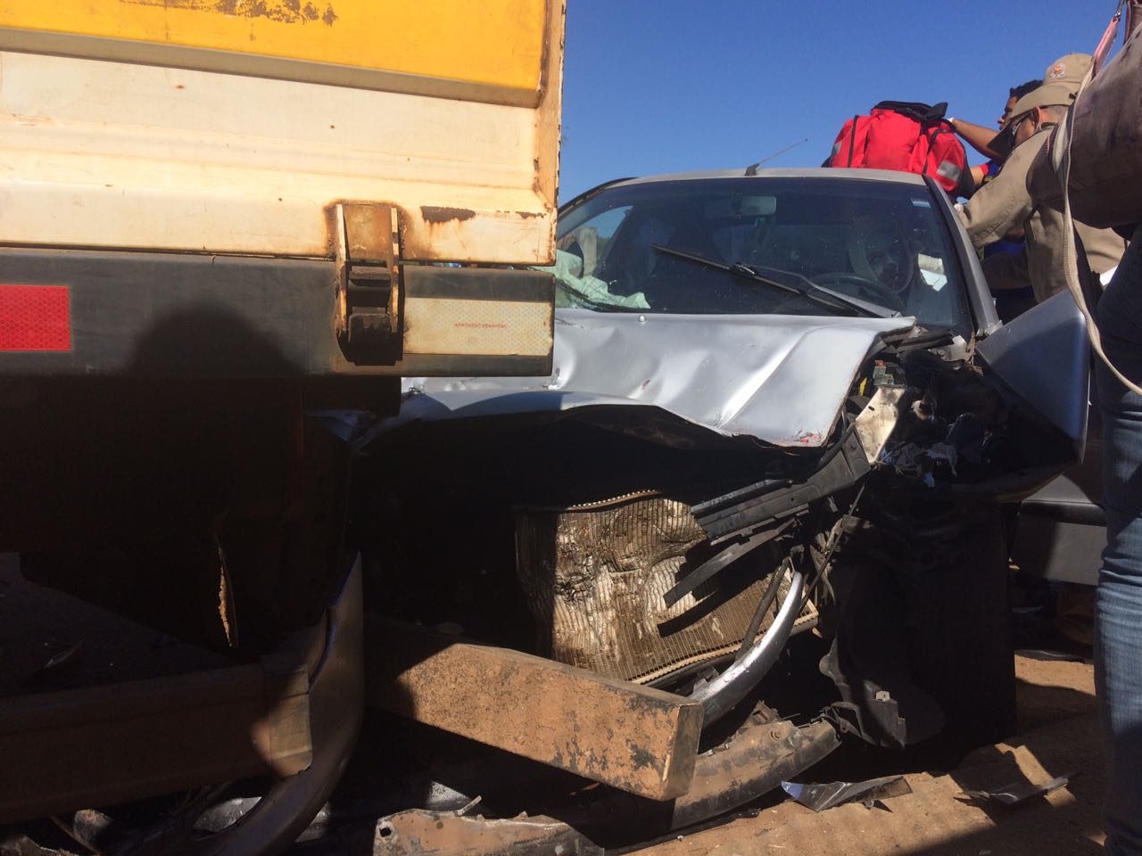 Após atropelar a mulher, o carro seguiu desgovernado e só parou ao bater violentamente na traseira de um caminhão estacionado em frente a madeireira, cerca de 150 metros depois.