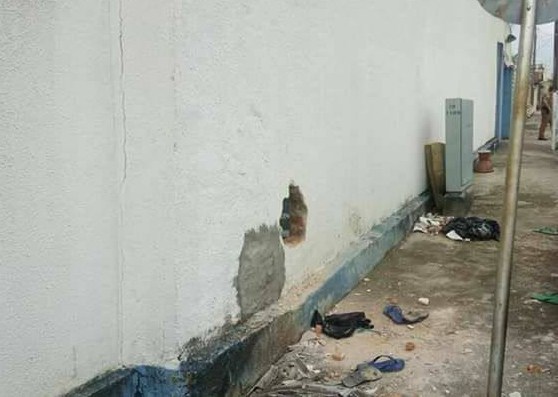 O buraco na parede do solário da Cadeia Pública de Ibaiti, por onde 21 presos fugiram na tarde de segunda-feira (12), foi aberto a marretadas.