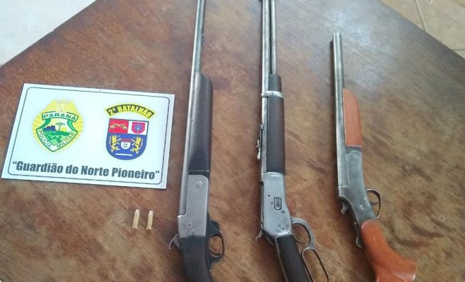 Em seguida, saíram correndo e adentraram a mata, abandonando uma espingarda marca Rossi de calibre .16; uma espingarda marca CBC, calibre .28; uma carabina puma de marca Rossi, calibre .38 e duas munições intactas de calibre .38.As armas e as munições foram apreendidas e entregues na Polícia Civil de Ibaiti para que fossem adotados os procedimentos normais.