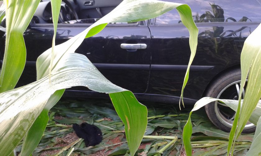 Após informações, a equipe PM localizou o veículo roubado, um VW/Gol de cor preta, em meio a uma plantação de milho, na estrada rural, próximo ao Bairro dos Fogaças. Ao lado do veículo foi encontrada uma toca ninja de cor preta, possivelmente utilizada pelos assaltantes.