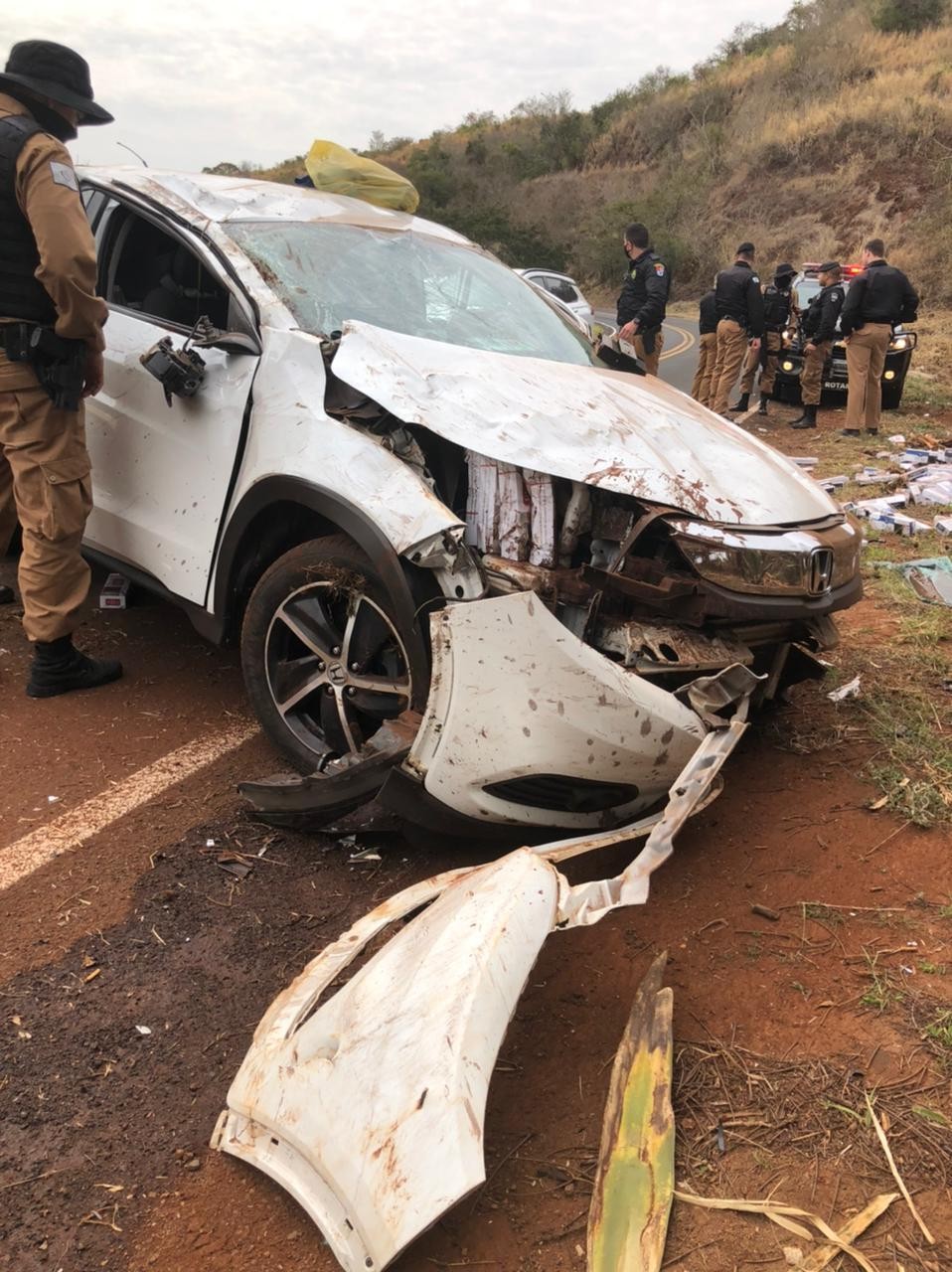Um veículo Honda HRV, carregado com cigarro contrabandeado do Paraguai, capotou na manhã desta quinta-feira (12), na PR-439, entre Santo Antônio da Platina e Ribeirão do Pinhal, no Norte Pioneiro paranaense.