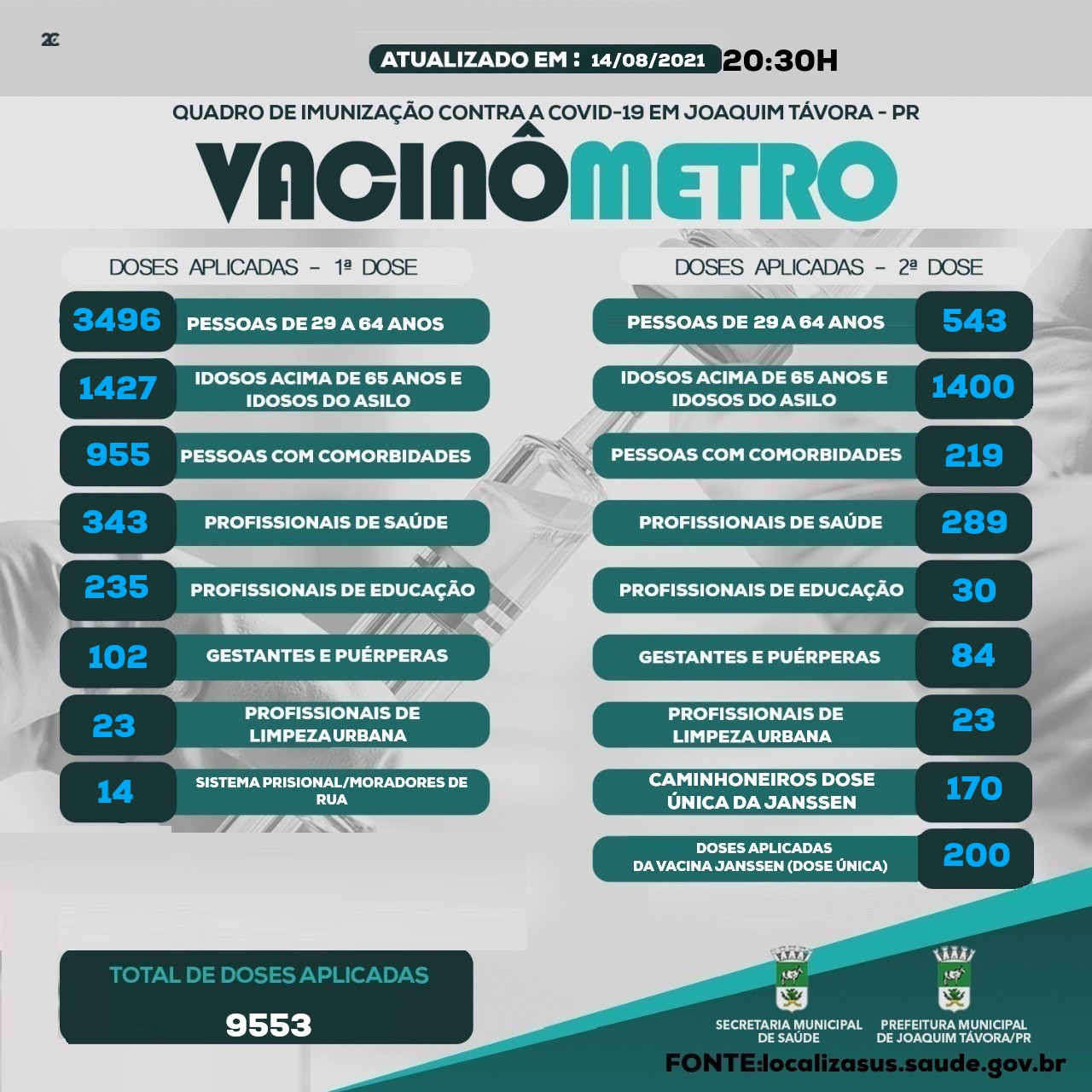 A Secretaria Municipal de Saúde de Joaquim Távora (PR), informou neste sábado (14), a cidade tavorense chegou à marca de 9.553 doses de vacinas aplicadas contra a Covid-19, durante os meses de campanha.