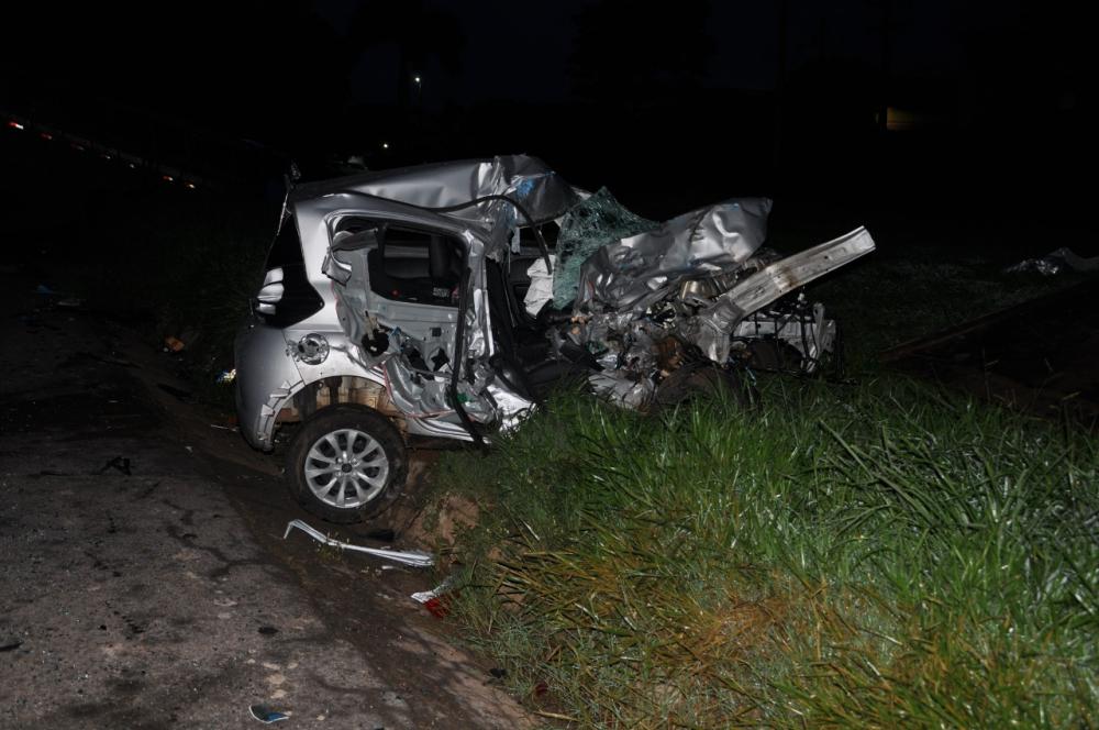 Com o impacto o carro ficou destruído, o motor e o câmbio foram arrancados e ficaram espalhados pela rodovia e acostamento.