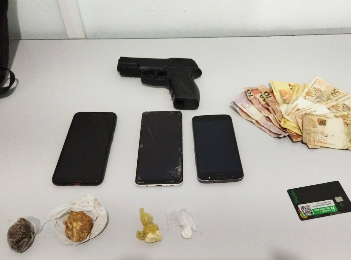 Na porta do carro um estojo com duas buchas de cocaína e uma de maconha, além de uma pedra grande de crack. numa mochila no banco de trás, havia um simulacro de pistola.
