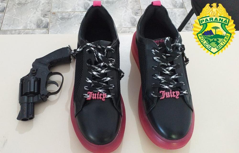 A equipe policial recebeu informações de populares sobre um roubo acontecendo em uma loja, e as características do autor foram repassadas. Durante patrulhamento, o suspeito foi avistado e jogou uma sacola com um par de tênis em um quintal após ver os policiais.