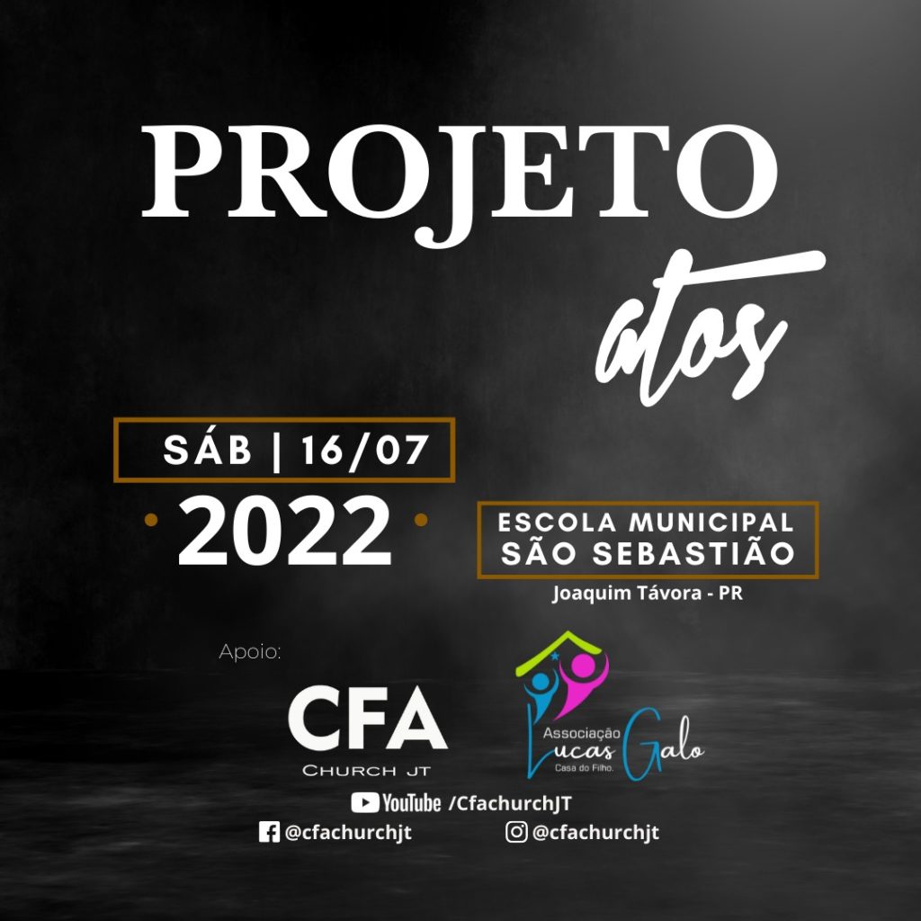 Neste sábado (16) das nove às 17 horas, na Escola Municipal São Sebastião , de Joaquim Távora, acontecerá evento social “Projetos Atos”, pela Igreja Centro Familiar de Adoração – “CFA Church” e a Associação Lucas Galo – Casa do Filho.