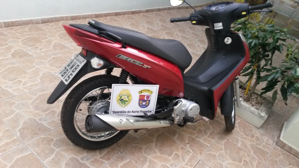 Policiais militares da cidade de Guapirama apreenderam uma motocicleta marca Honda, modelo biz, cor vermelha produto de roubo na cidade de Cambará no ano de 2013.