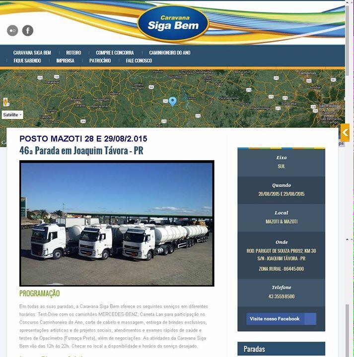 O posto e restaurante Mazoti em Joaquim Távora recebe nos dias 28 e 29 de agosto (sexta e sábado), a Caravana Siga Bem Caminhoneiro.