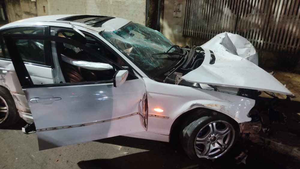 Um veículo BMW ficou destruído após o motorista perder o controle da direção e atingir duas residências na madrugada deste sábado (12), em Santo Antônio da Platina/PR.