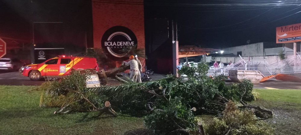 Equipes do Corpo de Bombeiros trabalharam na retirada de árvores que caíram com a força dos ventos em vias públicas e na rodovia Deputado Benedito Lúcio Machado (estrada da Platina), próximo ao bairro Jardim Colorado.