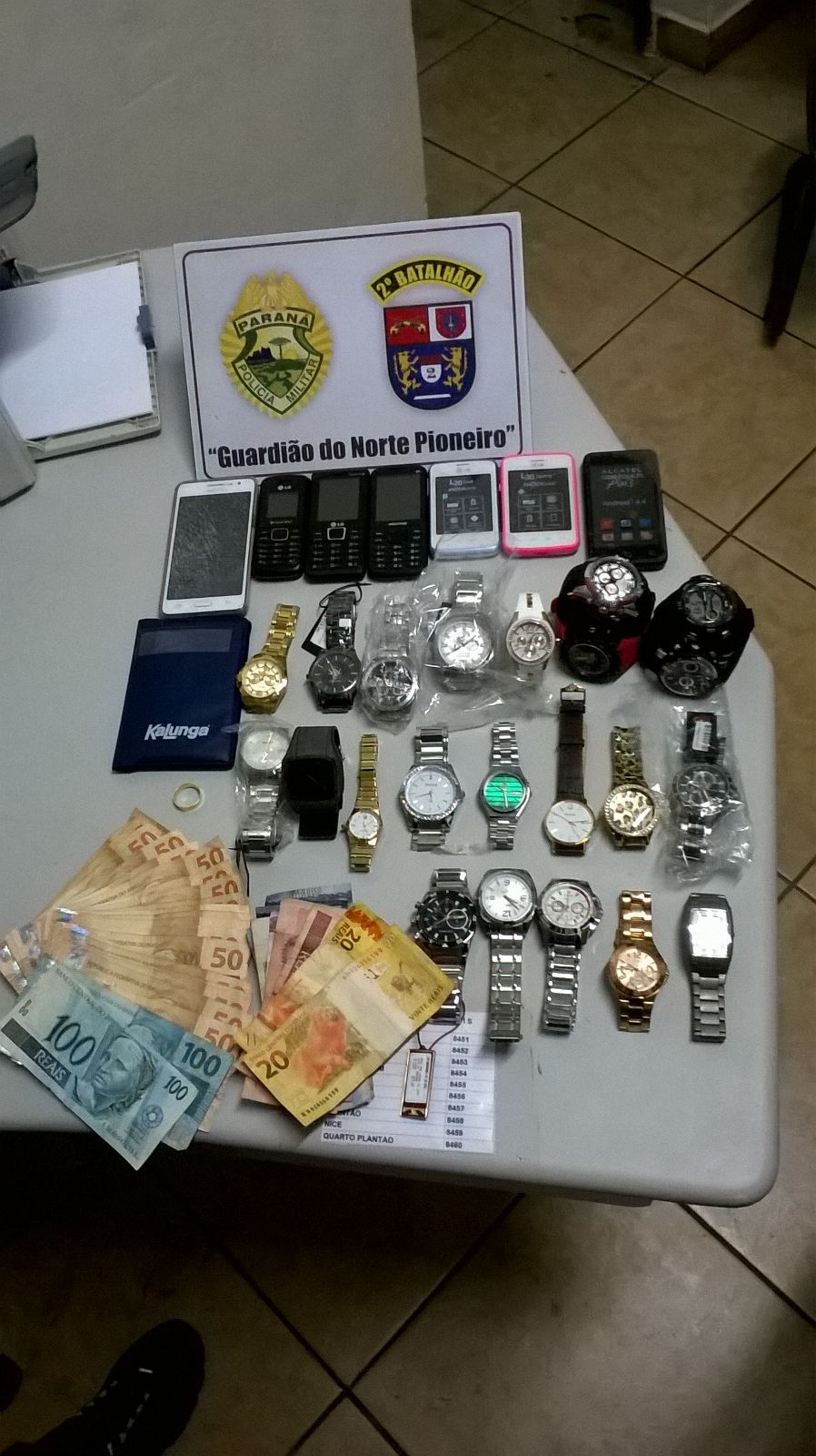 Uma operação policial foi deflagrada e a suspeita foi abordada quando desembarcava do ônibus, no Terminal Rodoviário de Ibaiti, por volta das 06h00min. Com a mulher os PMs encontraram 23 relógios (originais) de marcas renomadas (Orient, Diesel, Bulova) que correspondem as marcas de relógios subtraídos no roubo da relojoaria, além de R$1.200,00 em espécie e uma aliança de ouro.