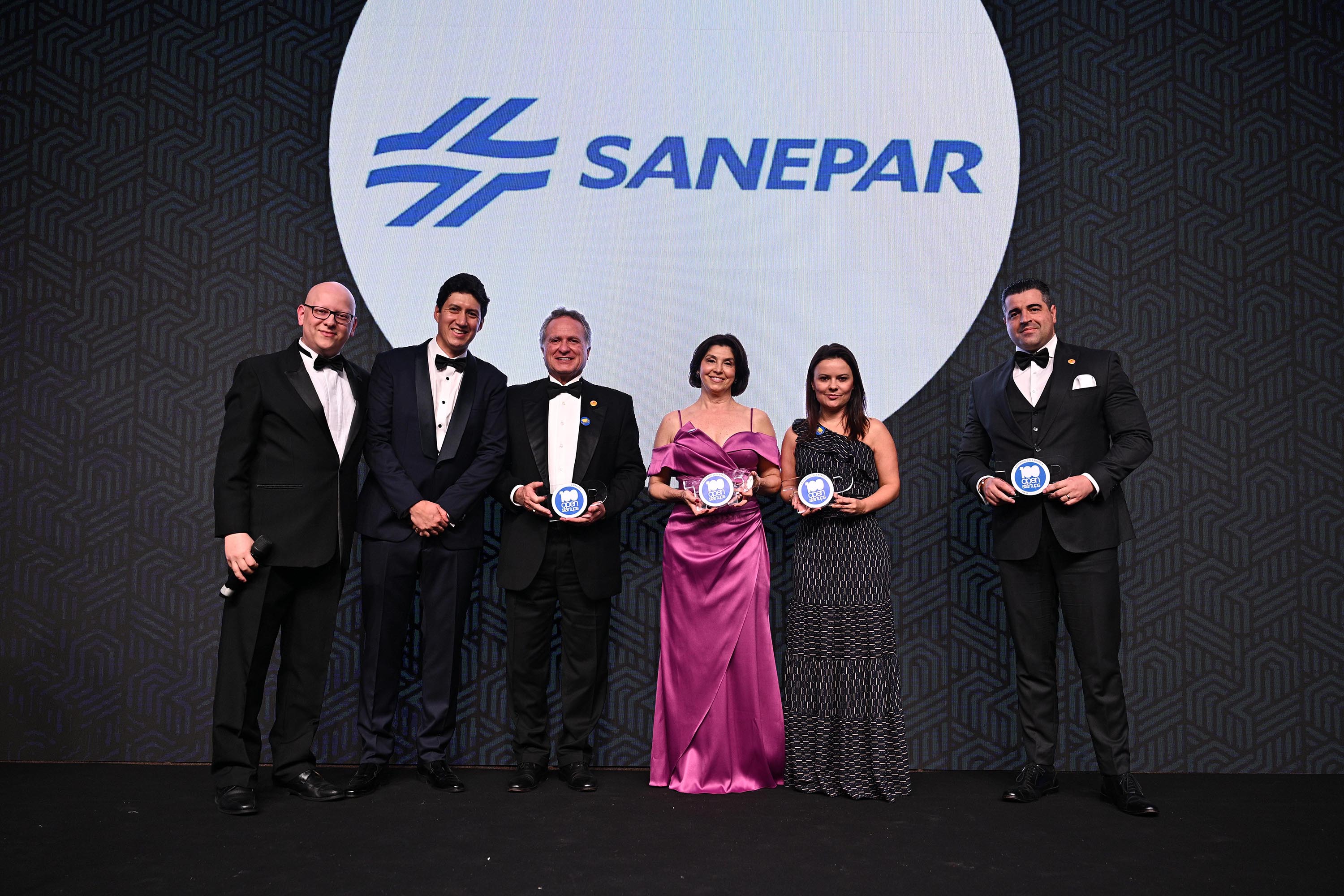A premiação foi recebida pelos diretores da Sanepar Anatalício Risden Júnior, de Inovação e Novos Negócios; Leura Conte de Oliveira, de Investimentos; Robson Augusto Pascoalini, de Governança, Riscos e Compliance; e Melissa Ferreira, de Comunicação e Marketing.