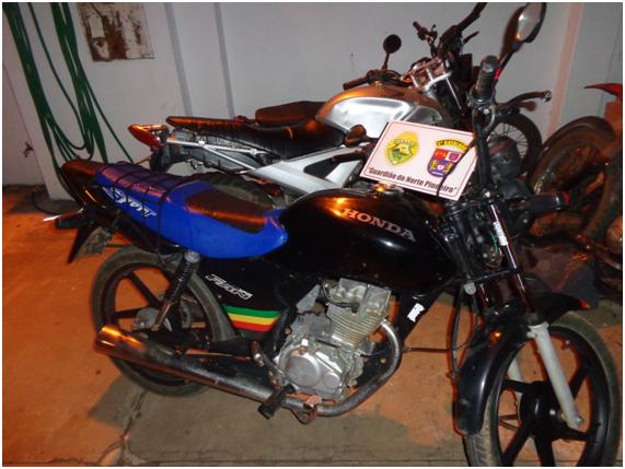 Em Cambará, no dia 29/08/2015, os PMs localizaram uma motocicleta honda/cg 125 today de cor verde, cuja cor original é vermelha, que havia sido furtada na Vila Rubim, na mesma cidade.