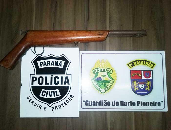 O foragido não foi encontrado, porém foi localizada uma arma de fogo, tipo garrucha, calibre .32 de fabricação artesanal, no forro do banheiro da residência.