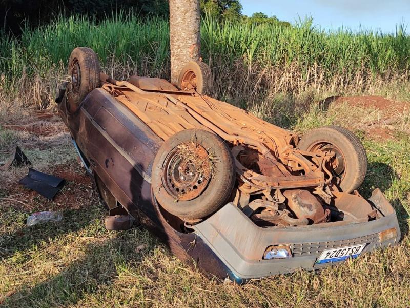 Um VW Voyage capotou e colidiu contra uma árvore na tarde deste sábado (24), na PR-431, entre Jacarezinho e Cambará.