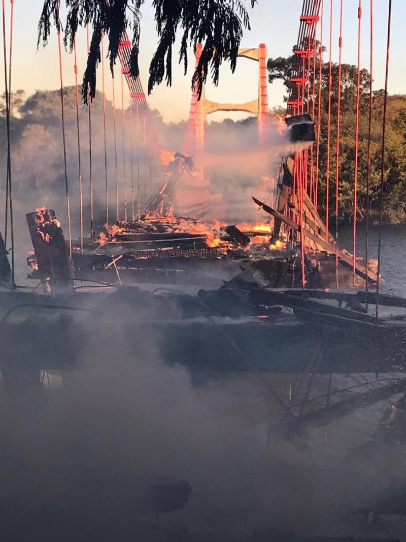 Um incêndio destruiu parte da Ponte Pênsil, na divisa entre Ribeirão Claro (PR) e Chavantes (SP), no fim da madrugada deste sábado (7).