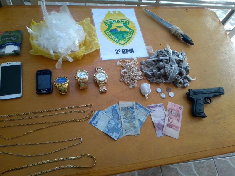Dois adolescentes foram detidos pela Polícia Militar na manhã de quinta-feira (10), em Guapirama, em posse de droga, um simulacro de arma de fogo e objetos de origem suspeita.