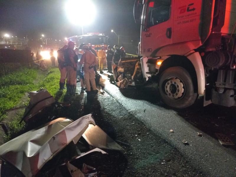 Um grave acidente de trânsito envolvendo um carro de passeio e um caminhão deixou três vítimas fatais na PR 092 - km 304 + 800m, em Joaquim Távora - próximo ao Posto Mazoti.