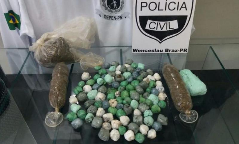 Numa ação rápida a equipe de agentes e policiais da Delegacia de Polícia Civil de Wenceslau Braz prendeu em flagrante o jovem Luiz Felipe da Silva, de 20 anos, que tentou jogar aproximadamente 400 gramas de drogas para o interior da carceragem da 36a. |