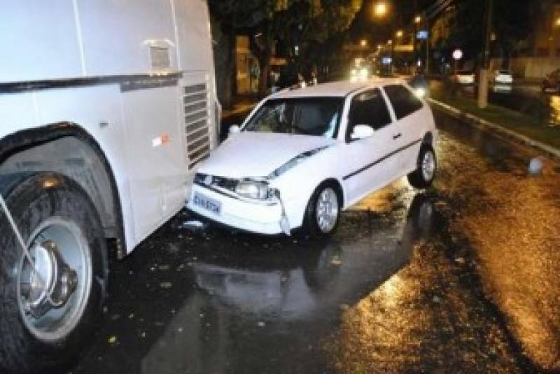 Um VW Gol praticamente entrou de baixo de um ônibus na avenida Getúlio Vargas emJacarezinho por volta das 22h10 desta quarta-feira (9).