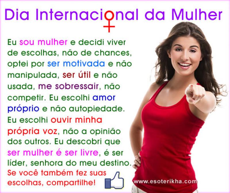 Dia 8 de março comemora-se o Dia Internacional da Mulher, uma data especial onde em todo o mundo são feitas comemorações e homenagens para estas que na verdade são dignas de serem homenageadas todos os dias do ano. Mais do que uma data comemorativa, |