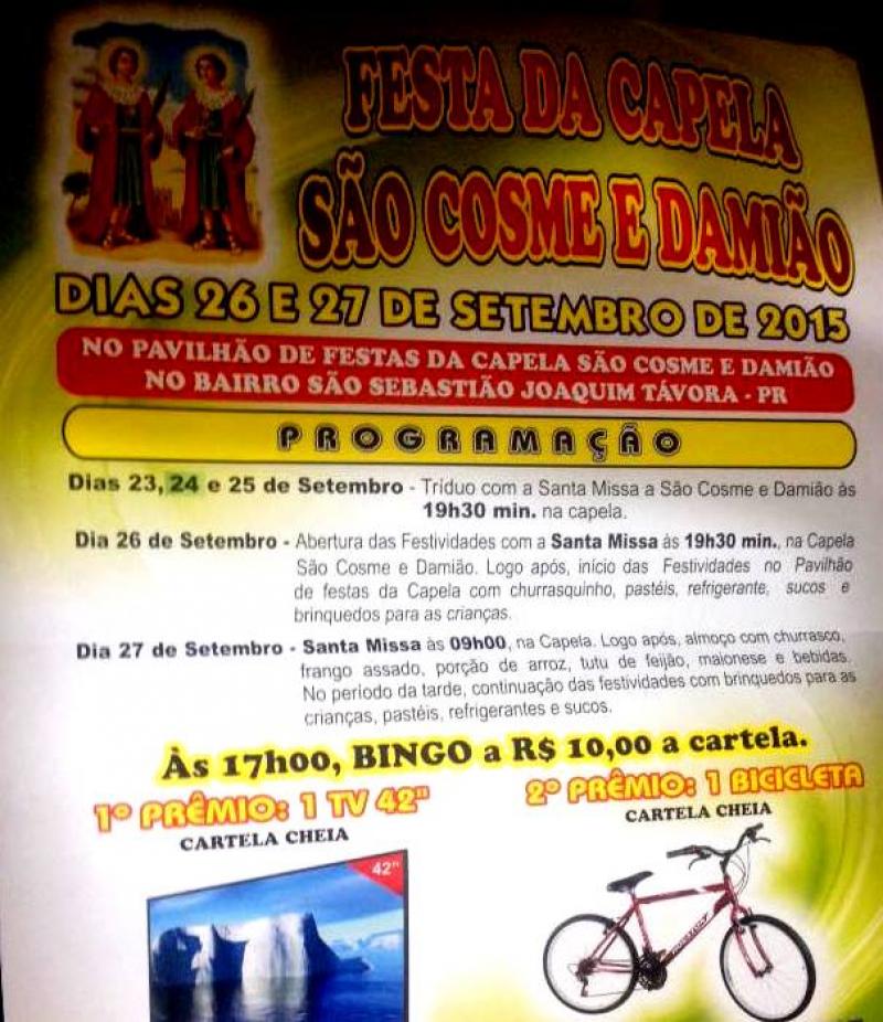 Acontece neste final de semana (sábado e domingo), festa na capela São Cosme e São Damião em Joaquim Távora.