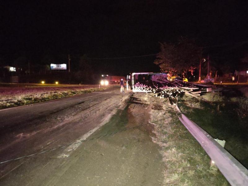 Um caminhão carregado com eucalipto tombou na noite desta sexta-feira (3), na BR-153, próximo ao entroncamento com a PR-092, em Santo Antônio da Platina/PR, a poucos metros do posto da Polícia Rodoviária Federal.