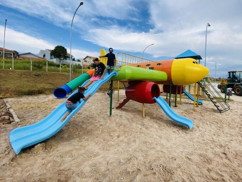 Uma das atrações do espaço de lazer é a réplica de uma aeronave suspensa a cerca de 1,5 metro do solo, onde as |