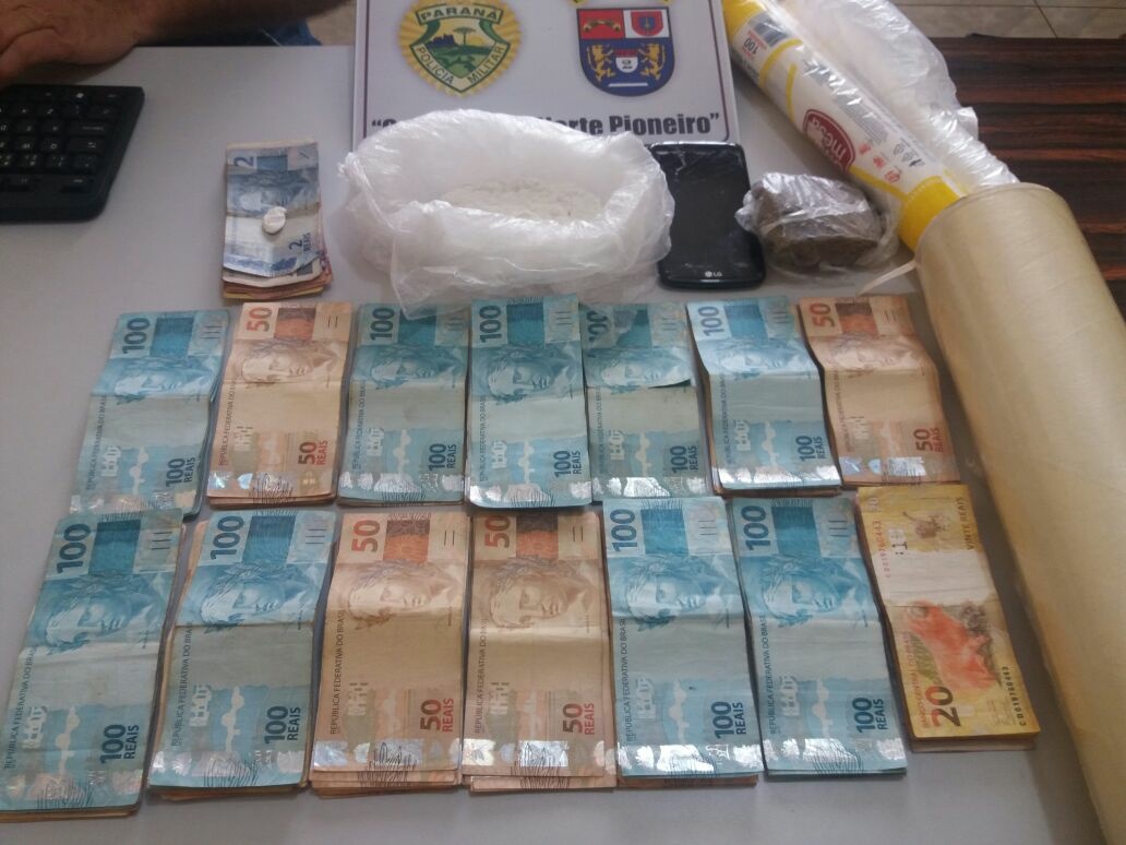 A PM estava monitorando uma casa na zona rural da cidade, local apontado como ponto de tráfico de drogas, e durante abordagem no endereço e a um veículo VW Gol, os policiais encontraram um tablete de maconha pesando pouco mais de 70 gramas, 100 gramas de cocaína, embalagens para preparar o entorpecente e R$ 13 mil em dinheiro.