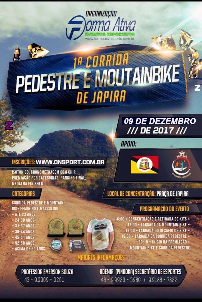 A Prefeitura Municipal de Japira através da Secretaria de Esportes em parceria com a Forma Ativa Eventos Esportivos promove a 1ª Corrida Pedestre e Moutain Bike em Japira.