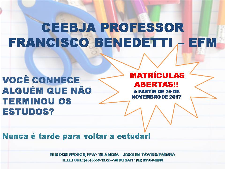 O CEEBJA PROFESSOR FRANCISCO BENEDETTI está com matrículas abertas a partir desta segunda-feira (20),para o ano letivo de 2018.